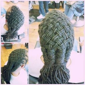 Sisterlocks are braided together in a dutch braid and turned into a spiral bun