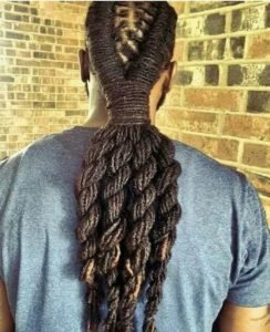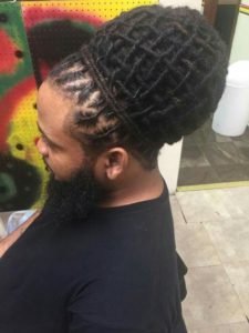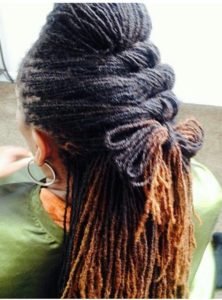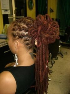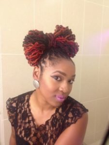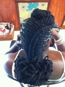 The petal bun is when you want something unique that can take 15 mins to create. You put your locs in a ponytail, then take sections of the ponytail and created petals by looping locs round your fingers then placing a rubber band round the base of the loops. That’s it!
