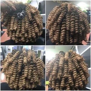 A pixie cut of different twist lengths throughout this style with beautiful ombre tips.