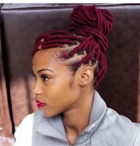 Spice up your locs by adding burgundy to your hair color. This color is great for those who want a dark bold color. Wear your hair down and add sunglasses for the perfect and cool summer look like the above picture.