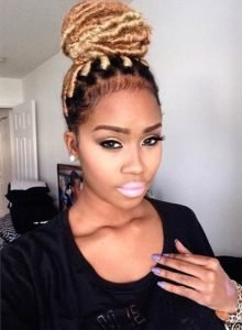 They say blondes have more fun, and you can see why in the picture. The blonde bun stands out from the black roots in the picture. The duel color and the interesting way the roots are braided makes this blonde hairstyle looks fun and cute.