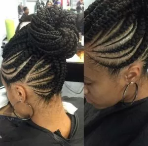 Start this wonderful hairstyle in the front with thin weaves that increase into more prominent braids. A high bun adds the right amount of glam to your style.