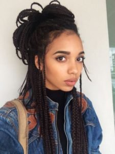The versatility of micro braids allows you to create unique hairdos. Opt for a high bun that is not braided to add volume to your style. The final hairdo is ultra-chic and perfect for a cool night with your friends.