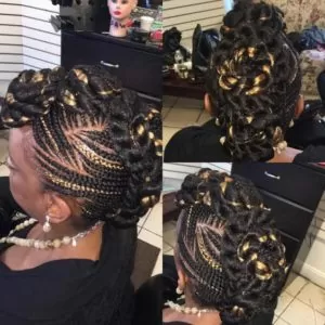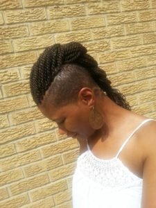 Mohawks are a popular ‘do to wear in these modern times. This one of a kind Mohawk is crafted with splendid cornrows and elegant twists. A golden hue adds spice to a look that is already unique. Don a style with edge.