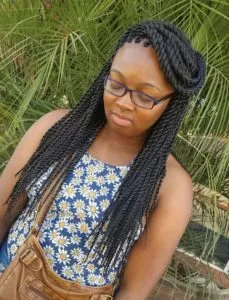 Braid your Senegalese twists into two lovely French braids. This hairstyle conveys a softer, more feminine look. As you dress up for your next classy dinner, this hairdo will match the vibe of the evening.