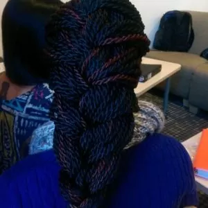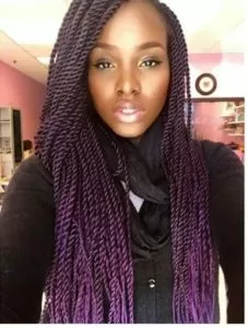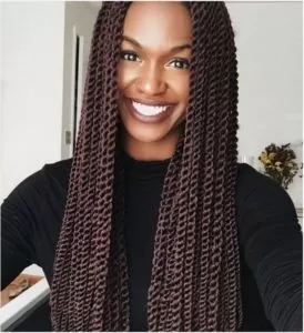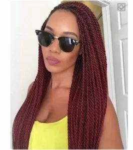 Burgundy is a deep hue for Senegalese twists. Burgundy conveys a sense of sophisticated style. A darker shade can be paired with bright colors of clothing for a unique contrast.