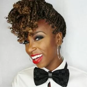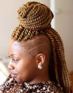Senegalese twists toned with a golden hue creates a dazzling look. A high-top knot paired with shaved sides is an edgy style. Spice up your tresses with this hip ‘do.