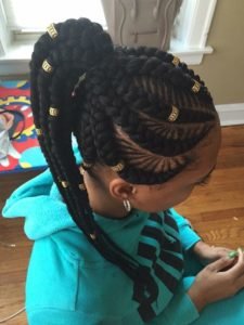 A Mohawk is a cool, edgy ‘do to don. African braids can be crafted into a superb Mohawk. Neat designs are created throughout the braids.