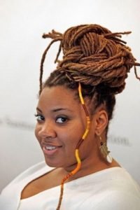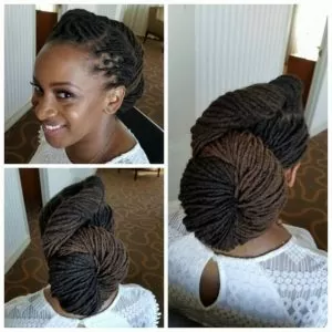 Yarn dreads can be designed into amazing up-dos. Here, beautiful dreads are styled on top of the head for a beautiful up-do paired with classy attire. Up-dos are a great way to showcase your style.