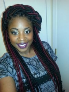 Brown highlights paired with black yarn dreads create a gorgeous hairstyle. Brown highlights are a great contrast throughout black dreads. A fancy half up-do is created for a gorgeous look.