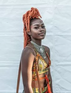 For a hip, fresh look, don orange yarn dreads. Here, the orange yarn dreads complement the colors throughout the outfit. Adding color to yarn dreads can complete your look.