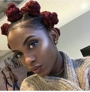 A fabulous look is created with these ultra-chic bantu knots. Flat twists are combined with bantu knots to design a classy, sophisticated look. The shade of red is a fashionable attribute.