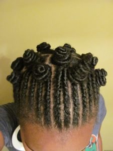 Bantu knots can be combined with other hairstyles to create unique, gorgeous ‘dos. Flat twists with a high bun is a beautiful up-do. The bantu knots resembling rosebuds are icing on the cake.