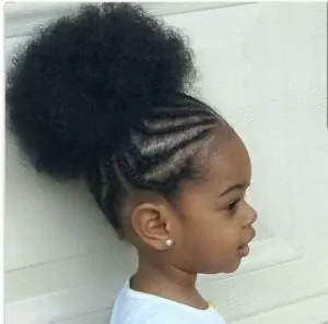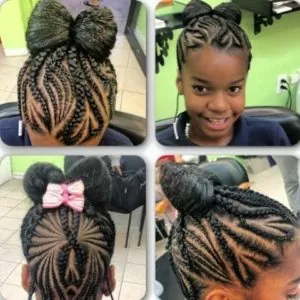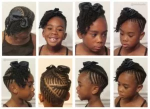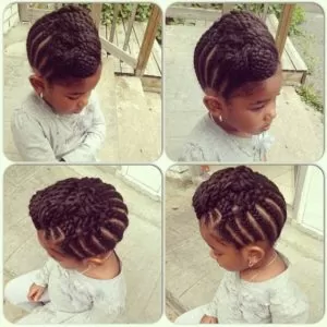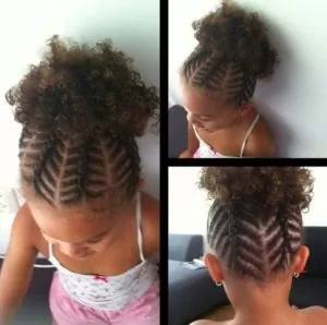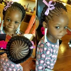 This is another great cornrowed high bun style. But for this look, flat twists also come into play. Add a bow or barrette to match your little one’s outfit.
