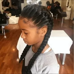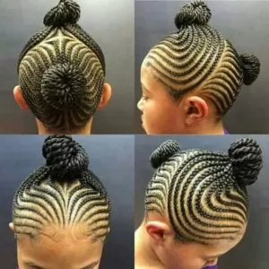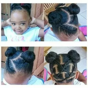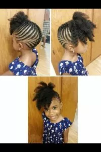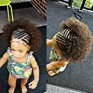 This is a really cute option if you don’t have time to braid all of your little one’s hair. Just cornrow the hair in the front and style the rest of the hair up into double buns.