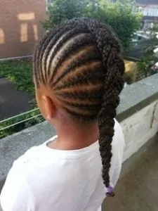 This look is a variation of the classic straight-back cornrows. The direction and shape of the braids give this style a slightly more grown up look that’s still fun and age-appropriate.