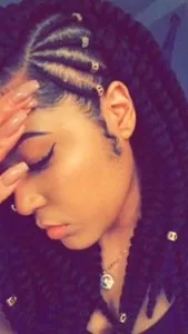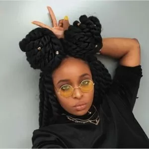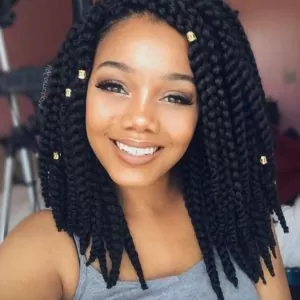 Hair jewelry is as popular as ever. Dress up your twists, braids, or faux locs with hair jewels. These jumbo twists look great styled into double buns and adorned with gold beads.