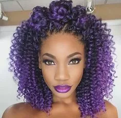 This electric purple color is sure to turn heads everywhere you go. These purple curly crochet braids are giving off serious outer space vibes: from the color to the knotted buns at the crown. They look great when paired with purple and pink makeup.