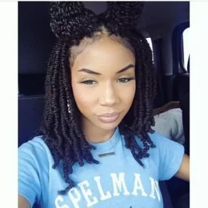 The double bun look continues to be as popular as ever. These shoulder length twists are styled into double buns in the front for a fun, casual look.