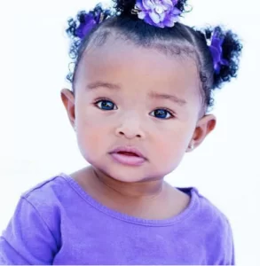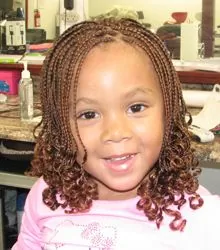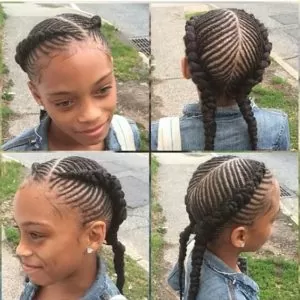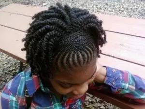 Here’s another gorgeous style for little girls. The hair is cornrowed into a side ponytail and adorned with an adorable bow. Add some matching barrettes to the ends of the braids to complete the look.