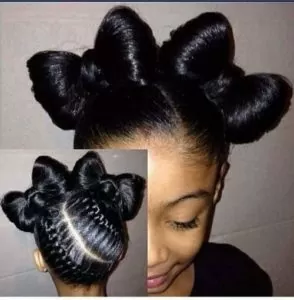 This is a great style for special occasions or picture day. And even though it may look fancy, it’s actually pretty easy to create. Starting on stretched, moisturized hair, split the hair into three sections and style the hair into three buns going down the center of your little one’s head. Leave a small section out in the front and style it into long curly bangs to finish the look. Now, this appears to be very stylish.