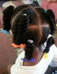 Chunky twists are a classic style for little girls. Twists are also great for parents who don’t know how to do more intricate styles like cornrows or flat twists. There are so many ways to style chunky twists, you’ll never run out of options. Add colorful barrettes on the ends to complete this classic look.