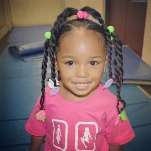 This beautiful style combines cornrows and twists. The cornrows create a natural headband effect, helping keep your little one’s hair out of her eyes. This is another great low-maintenance style that will last through even the most active days.