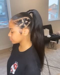 If you’re looking for an easy and quick rubber band style, you can choose to only section off the sides of your hair into criss crossing braids and pull all your hair into a sleeek ponytail.