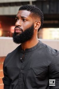 For a look befitting of a gentleman, don a neat temple fade. The hair on top is kept short while the temple fade blends in with your facial hair. A suave, cool look is established.