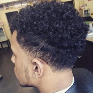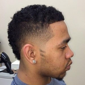 Create a textured temple fade with a curved line that fades just above the ear. For added texture and volume, have your hair on top cut to just over one inch in length.