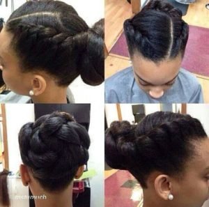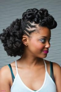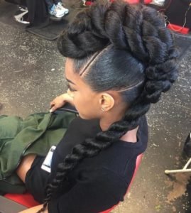 A stylish way to wear long Mohawk updo. By parting the hair and making a few small cornrows beside the parts, then pulling all the remaining hair towards the middle. If you’ve got naturally long hair, then simply do a few chunky twists with the ends and pin the under. If not, you may get extensions with Kanekalon fiber and then secure those down with hair pins. Either way, this hairstyle is a must-do in your life-time of styles.