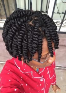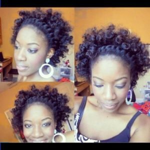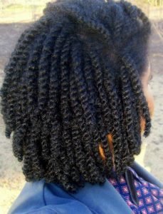 Another version of twist out, except in this style the hair comes out more spiral that with a flat twist. A great, funky option for a girls’ night out!