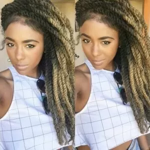 These ombre twists allow you to sport a two-toned braided do. It actually looks the best on Marley braids than with regular Kanekalon. What the stylists do is blend two different fiber colors together a little ways after twisting down the first color.