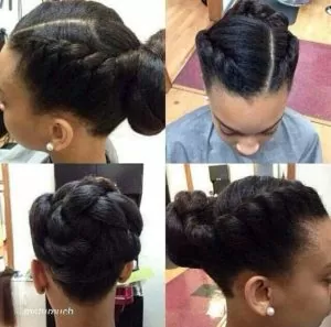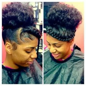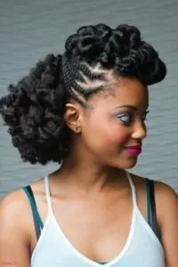 A stylish way to wear long Mohawk updo. By parting the hair and making a few small cornrows beside the parts, then pulling all the remaining hair towards the middle. If you’ve got naturally long hair, then simply do a few chunky twists with the ends and pin the under. If not, you may get extensions with Kanekalon fiber and then secure those down with hair pins. Either way, this hairstyle is a must-do in your life-time of styles.