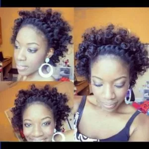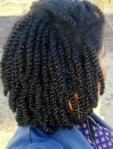 Another version of twist out, except in this style the hair comes out more spiral that with a flat twist. A great, funky option for a girls’ night out!